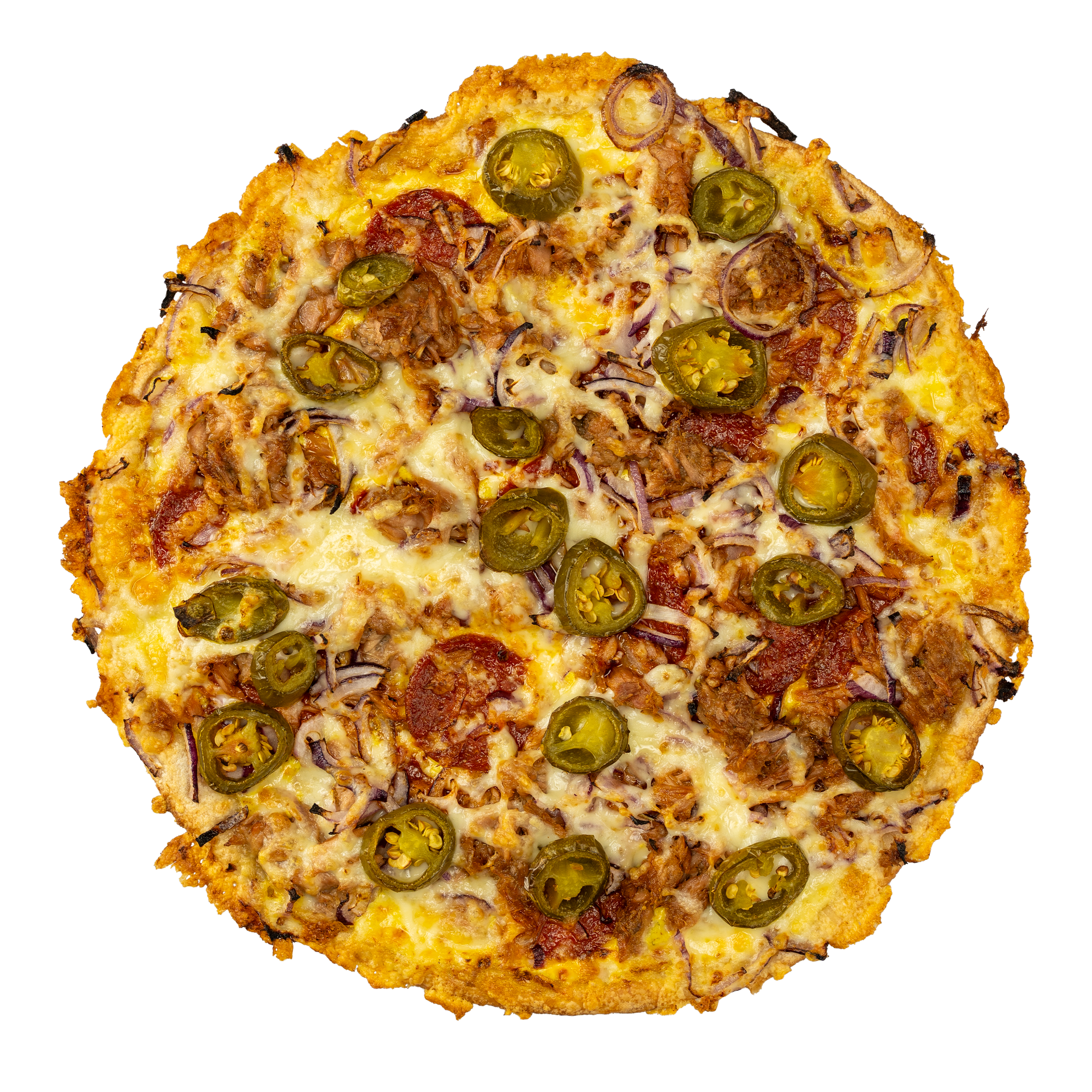 Unsere Cevap Pizza startet mit mildem Ajvar, dazu rote Zwiebeln, Paprika-Mix und milde Peperoni.